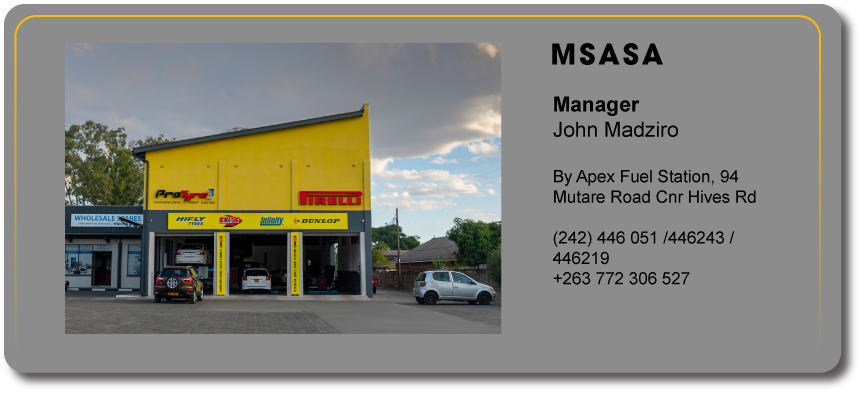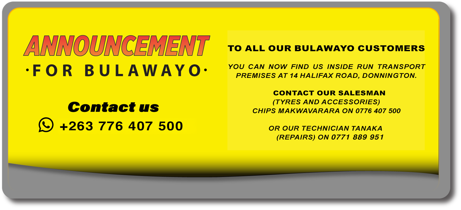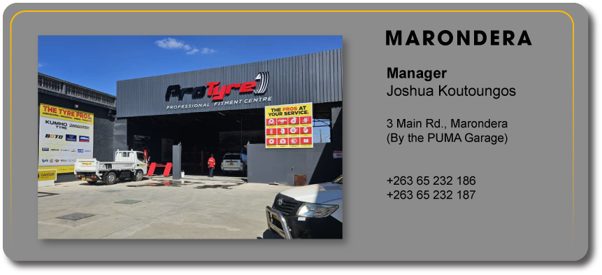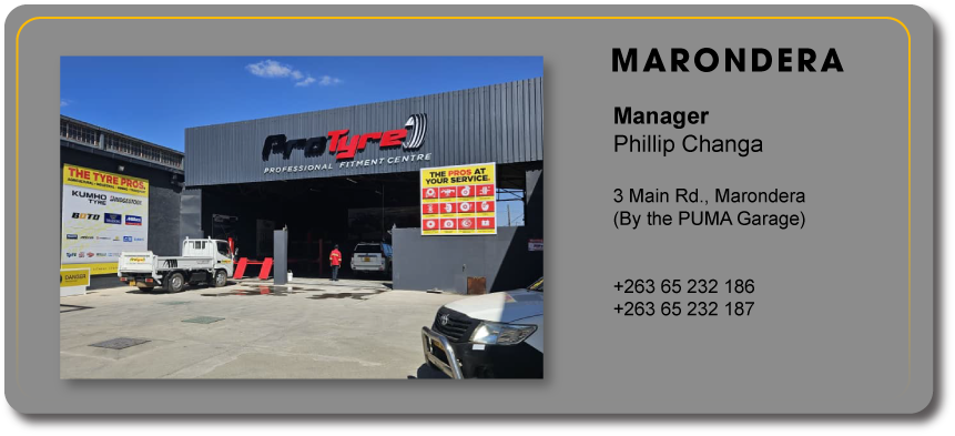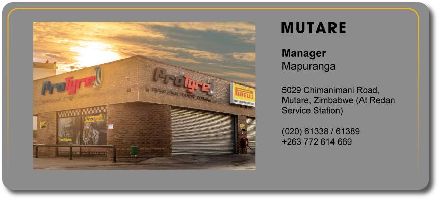 See our network of tyre sales and services outlets in Harare CBD, Borrowdale (Sam Levy’s Village), Msasa, Marondera, and Mutare.
